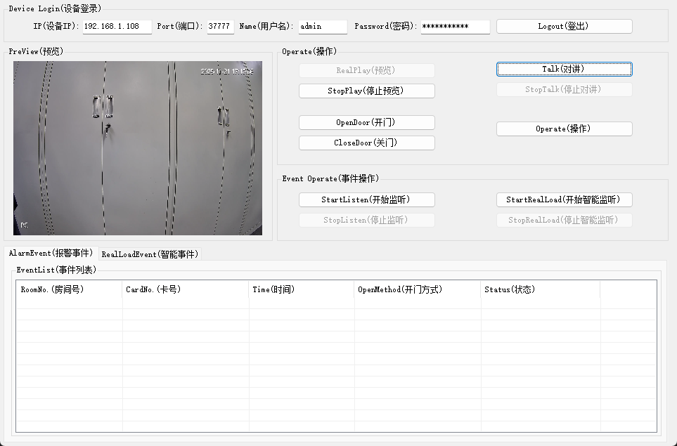 按F5运行。输入IP地址、端口号(默认37777)、用户名和密码。点击”登录“按钮,并选择”预览“,实时画面显示出来。