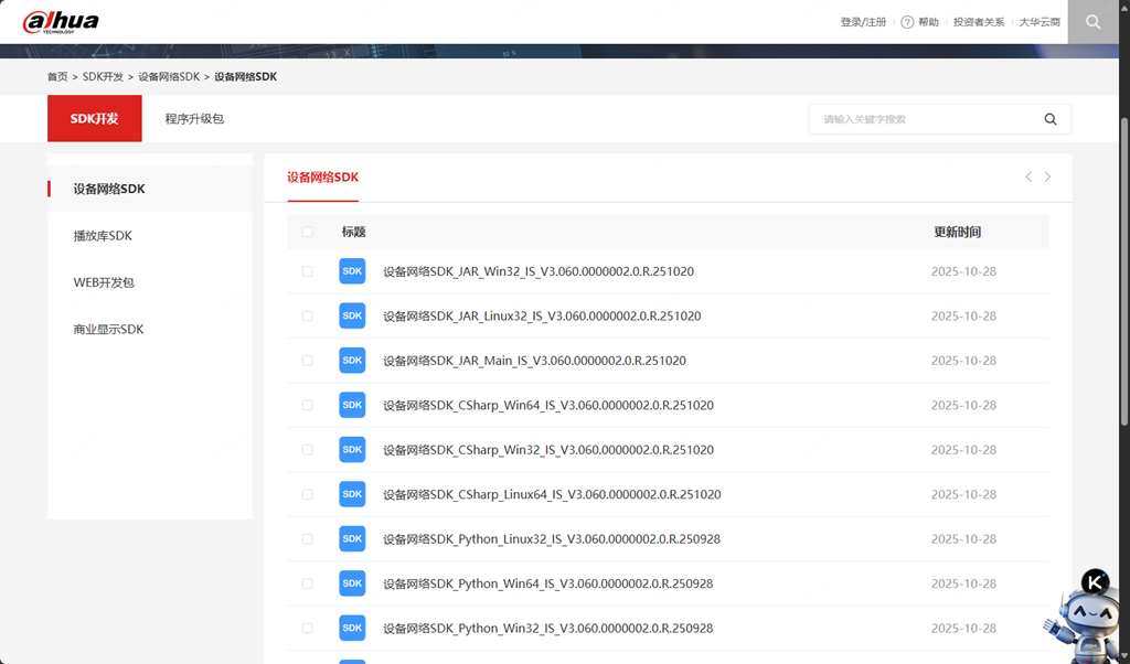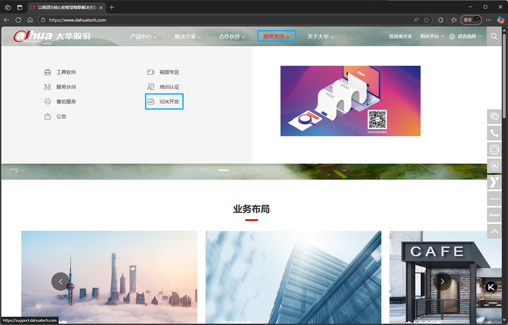 进入大华官网(www.dahuatech.com)在”服务支持“下找到”SDK开发“并点击。