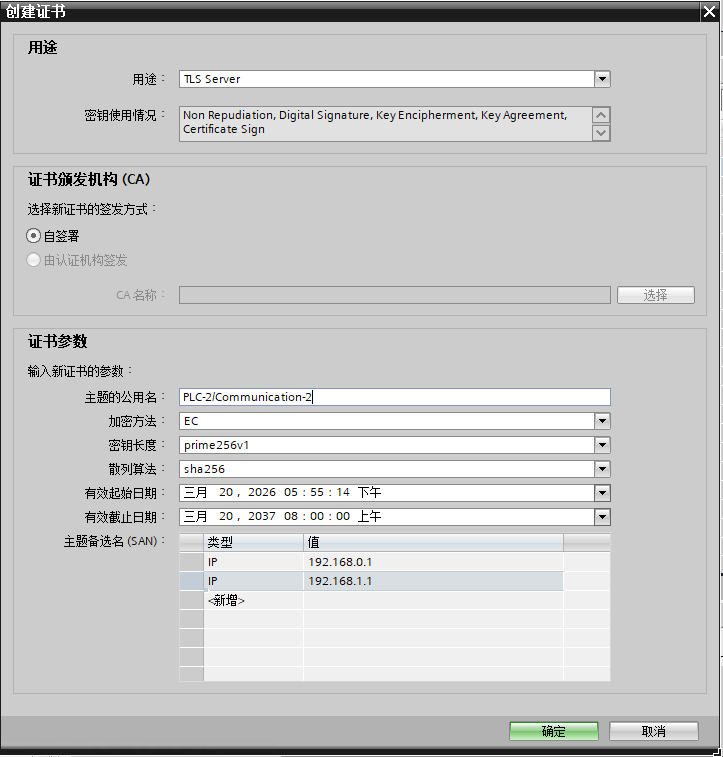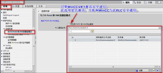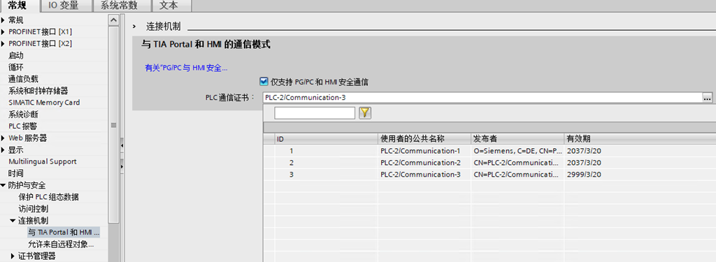 注意:只要WinCC V8.1中激活安全通信,此处的“仅支持 PG/PC 和 HMI 安全通信”复选框是否勾选不影响安全通信。重点是在PLC通信证书处必须选择一个证书,可以通过创建按钮新建证书。