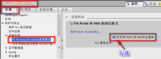 S7-1200固件版本>=4.5 激活”仅支持HMI安全通信” |