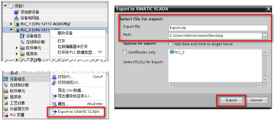 安装 SIMATIC SCADA Export 插件 ,编译项目后导出包含证书和 PLC 变量信息的 SCADA 数据包。