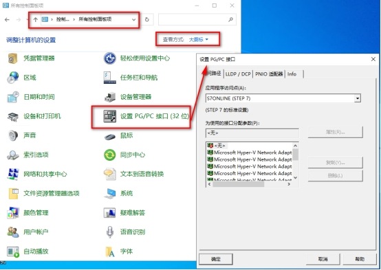 在运行WinCC 项目的电脑中,打开控制面板,查看方式选择大图标,鼠标双击“设置 PG/PC 接口”打开其配置对话框。