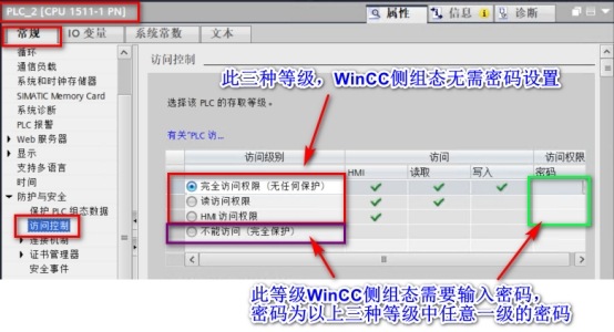 这种情况下,如果在访问控制中选择“完全访问权限/读访问权限/HMI 访问权限”中的任意一级,WinCC项目中的通信组态无需填写任何访问密码。如果选择“不能访问”,WinCC项目中的通信组态需填写“完全访问权限/读访问权限/HMI 访问权限”中的任意一级的访问密码。