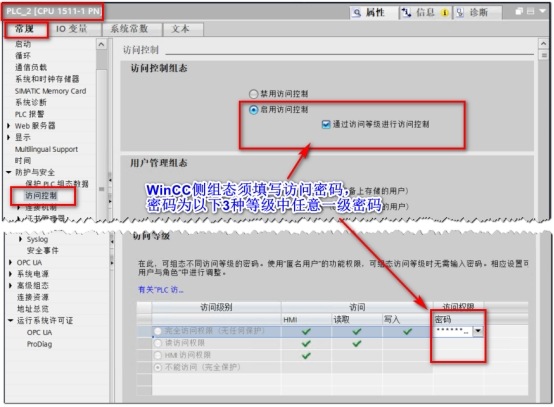 如果选择启用访问控制,需要勾选“通过访问等级进行访问控制”。WinCC项目中的通信组态需填写“完全访问权限/读访问权限/HMI 访问权限”中的任意一级的访问密码。