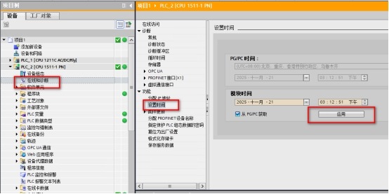 安全通信中设备的系统时间需要在证书有效期内,所以需要校准 PLC系统时间。把PLC程序转至在线,通过在线诊断中的设置时间功能,校准PLC系统时间。